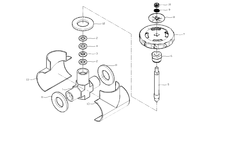 如圖2所示,本發(fā)明產(chǎn)品包括閥體1、主軸墊圈2、主軸密封件3和4、主軸5、主軸帽6、手柄7、真空絕緣殼體結構,由彈簧8、彈簧墊圈9和螺母10以及用于焊接的襯套11組成的基本阻隔流體結構, 用于真空釬焊的襯套 12 和真空外殼 13 輸了。主軸墊圈2、主軸密封件3和4、主軸5和主軸蓋6與閥體1組裝在一起,作為關(guān)閉流體的基本功能。)、彈簧墊圈(9)和螺母(10)組裝在一起,起到關(guān)閉流體的作用。將焊接襯套11和真空殼13通過(guò)一般氬焊等相互粘接,以確保一定的真空空間并支撐真空殼13,真空殼13和真空殼13在10-5托或更小的真空狀態(tài)下通過(guò)真空釬焊粘合,以保持閥體1和真空殼13之間的空間在真空狀態(tài)。真空箱形成的真空空間起到阻擋輻射熱和從外部傳遞的對流熱的作用。